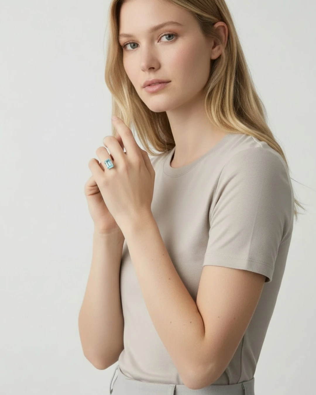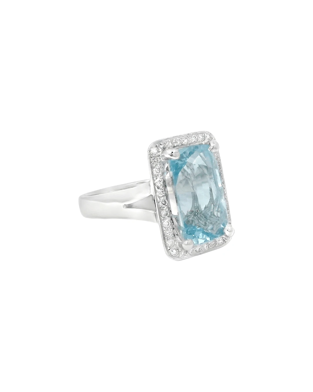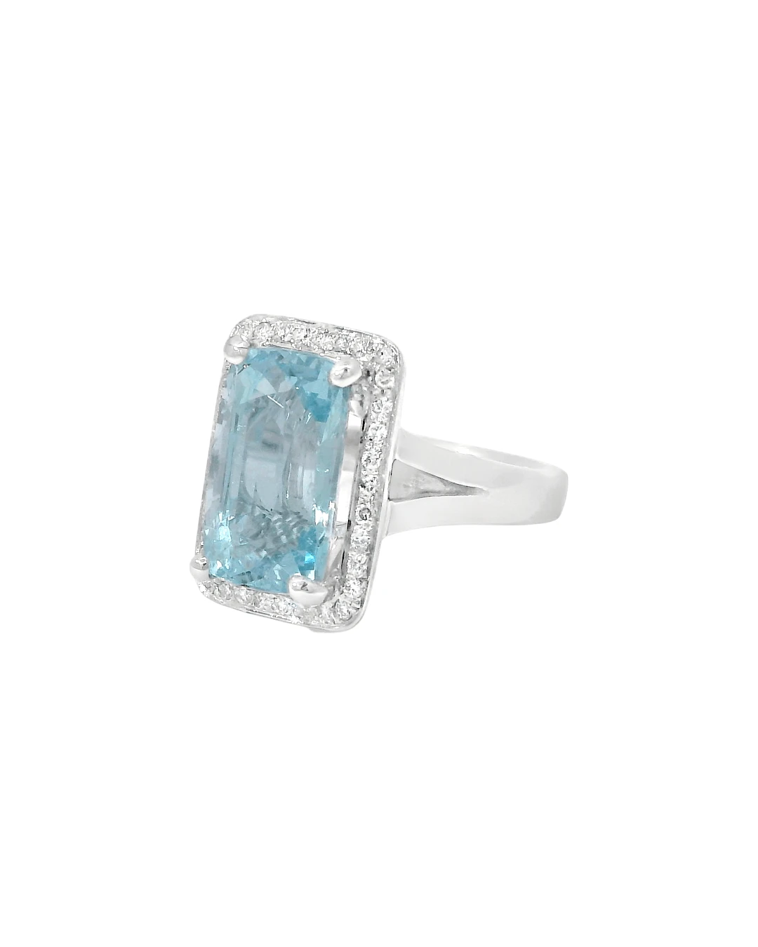 The elongated rectangular aquamarine is secured with four prongs and bordered by a fine line of diamonds that follows its outline closely. The single halo keeps the focus on the centre stone while adding definition, allowing the ring to sit comfortably and cleanly on the hand.