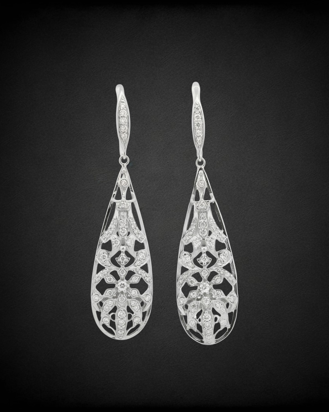 These earrings take their form from the elongated arches and openwork grids of colonial-era domestic architecture. Cast in white gold, set with natural diamonds, the structure balances floral suggestion with engineered symmetry — motifs that foreshadow the formal jewellery grammar that would emerge from the same port-city culture.